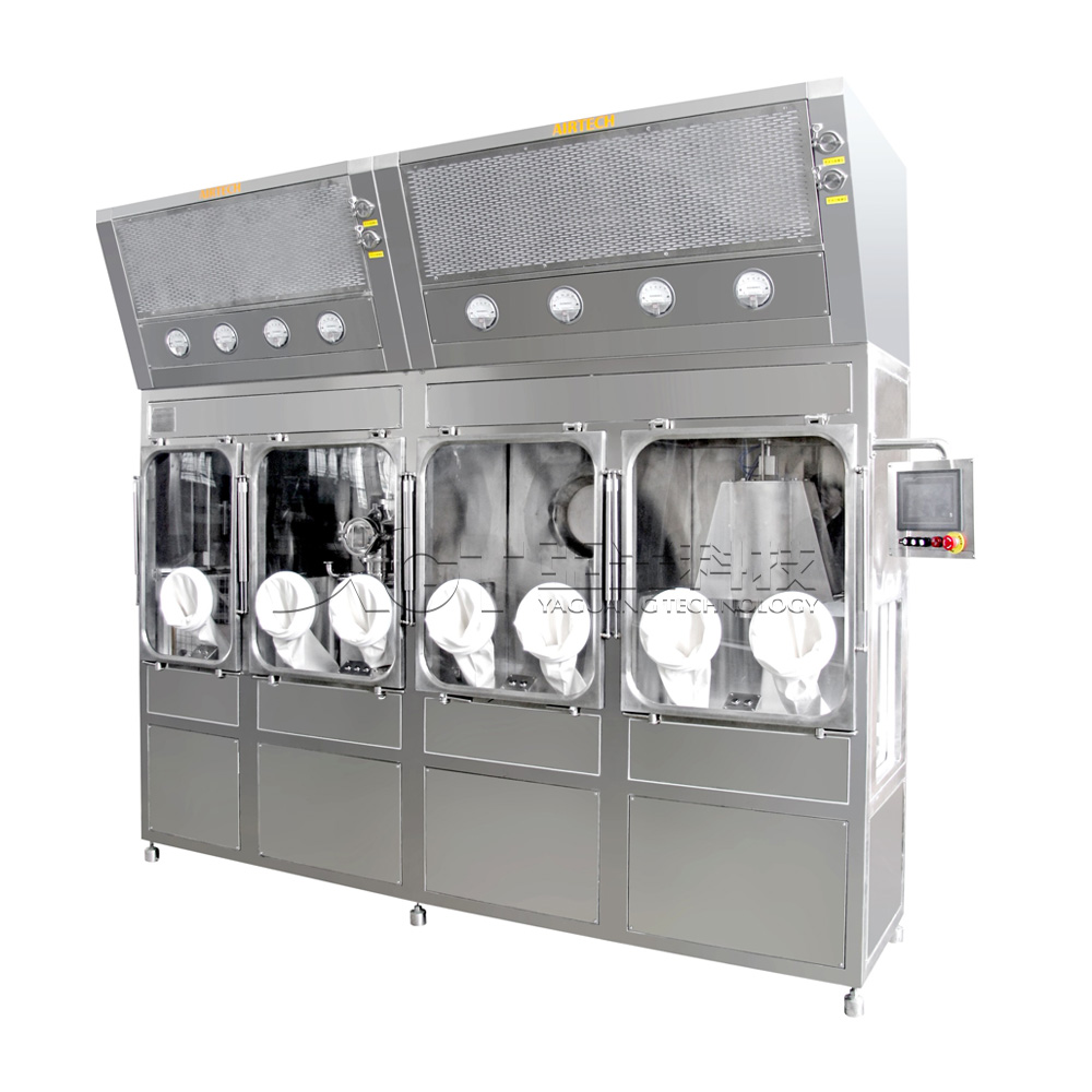 该系统在全密闭的百级层流环境下对原料药进行高精度分装及密闭轧盖。分装结构由带有称重模块的提升装置与送料装置出料口进行对接出料;在送料装置下料口装有粉尘收集器,以减少对分装区环境的污染;轧盖装置采用全自动弹簧内收缩原理对铝瓶进行密闭封口;全程采用PLC闭环控制电控系统,以达到全自动定位分装,称重、轧盖。